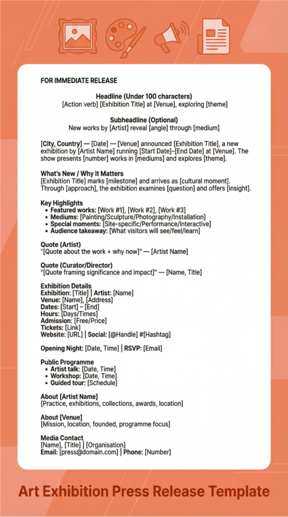 This section walks through the process from blank page to finished release for a specific exhibition. I will use one recurring fictional exhibition as an example throughout: “Echoes in Glass: Installations by Marisol Vega,” opening April 10, 2026 at Bayfront Museum of Art, Miami.